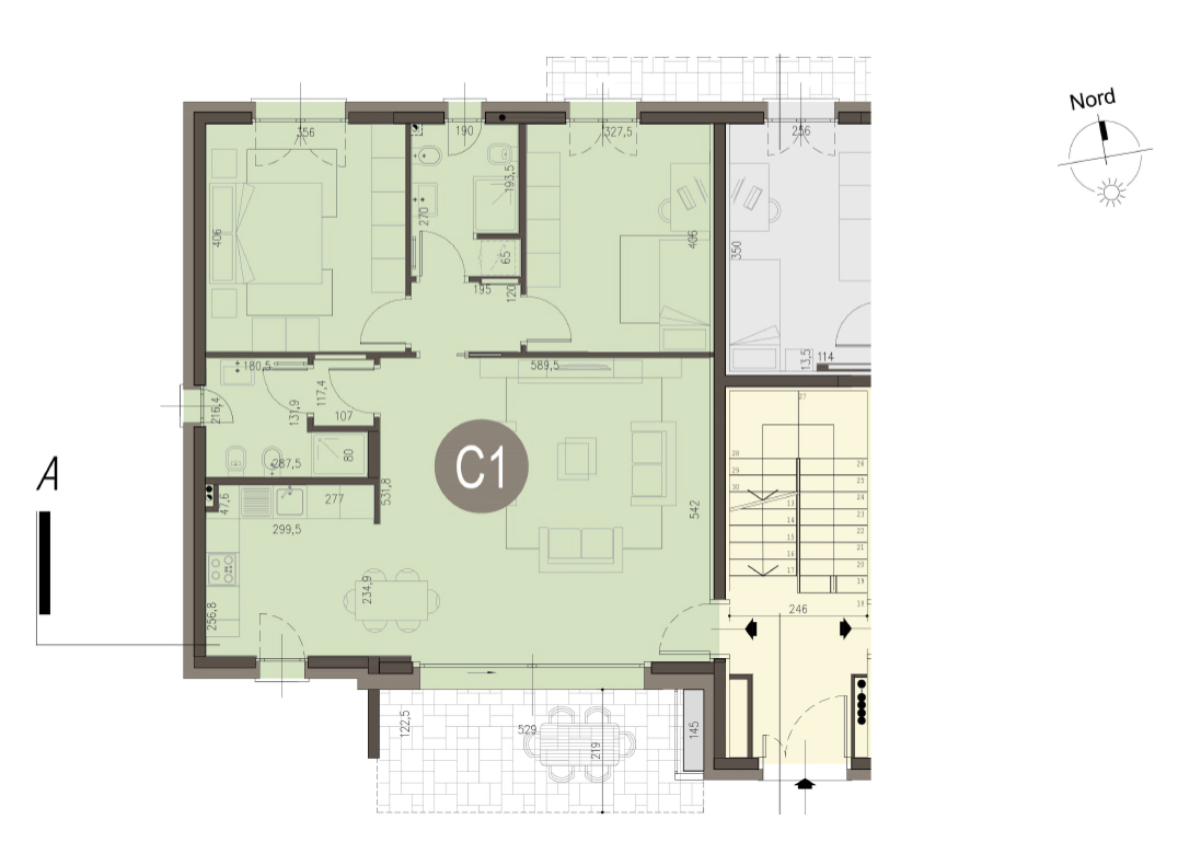 Trilocale a piano terra con soggiorno,cucina abitabile, due camere, due bagni, disimpegno, portico e giardino di proprietà di 197 mq. Classe energetica A3 valore di progetto.