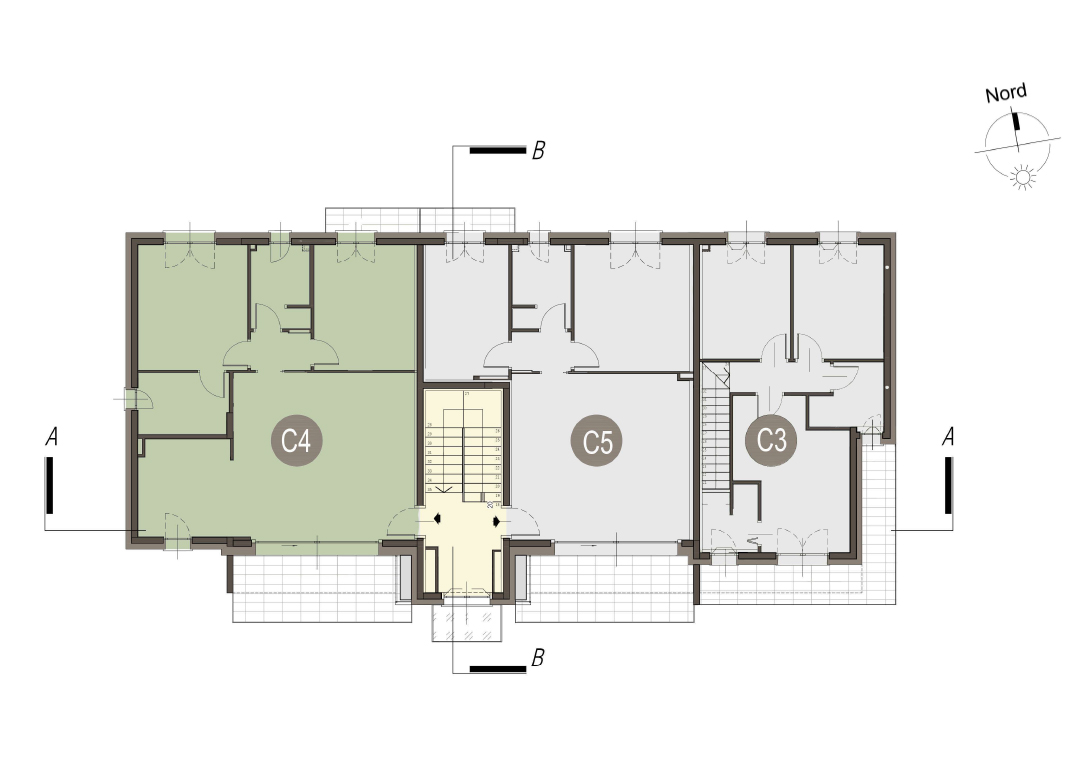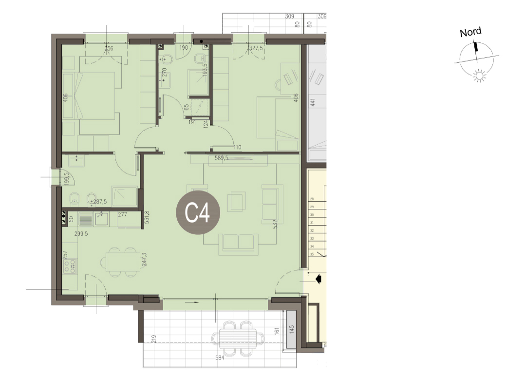 Trilocale a piano primo con soggiorno/cucina, due camere, un bagno, disimpegno, terrazzo di 14mq. Classe energetica A3 valore di progetto.