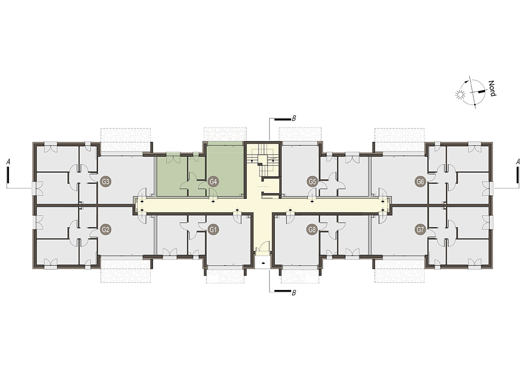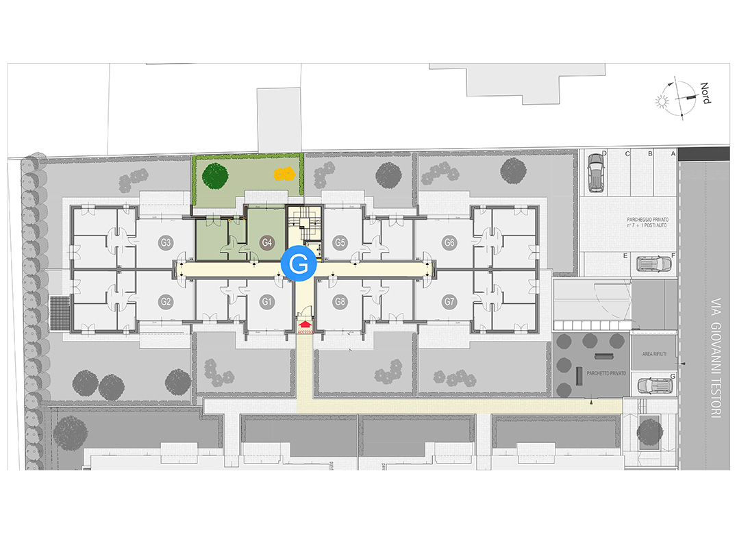 Bilocale a Piano Terra con soggiorno con cucina, una camera, un bagno, disimpegno, portico e giardino di proprietà di 76 mq. Classe energetica A3 (valore di progetto).