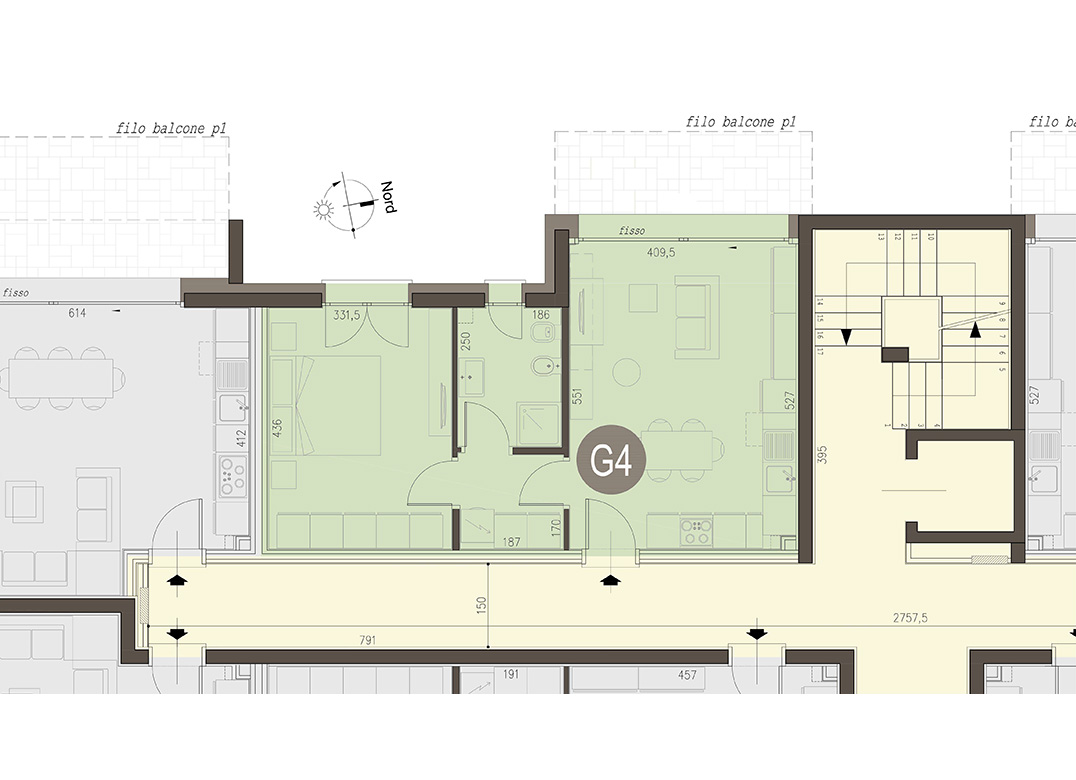 Bilocale a Piano Secondo con soggiorno con cucina, una camera, un bagno, disimpregno e terrazzo di 6 mq. Classe energetica A3 (valore di progetto).