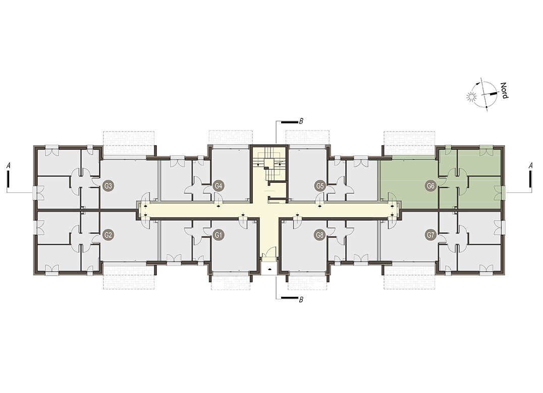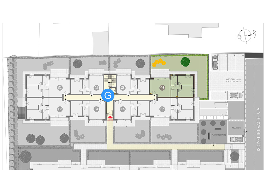 Bilocale a Piano Terra con soggiorno con cucina, una camera, un bagno, disimpegno, portico e giardino di proprietà di 76 mq. Classe energetica A3 (valore di progetto).