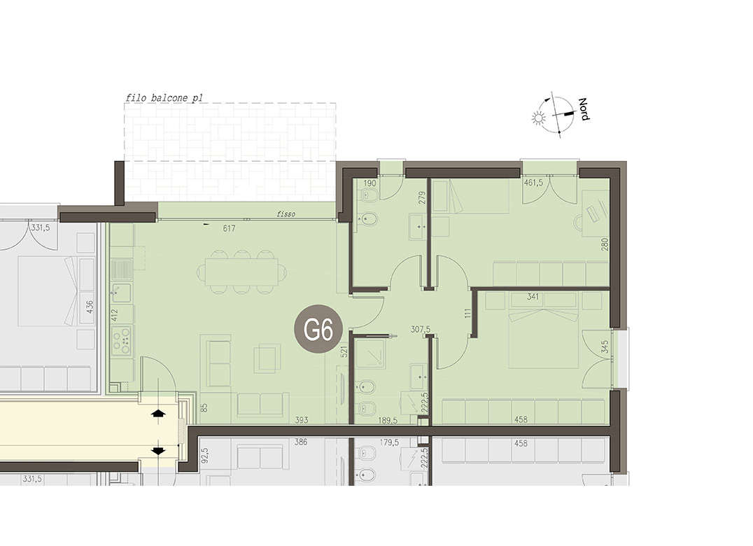 Trilocale a Piano Primo con aggiorno con cucina, due camere, due bagni e terrazzo di 13 mq. Classe energetica A3 (valore di progetto).