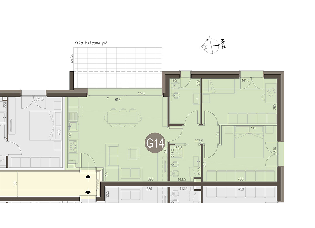 Trilocale a Piano Primo con aggiorno con cucina, due camere, due bagni e terrazzo di 13 mq. Classe energetica A3 (valore di progetto). Le immagini e la rappresentazione grafica dei prodotti (immagini, dati tecnici e descrizioni) è realizzata al solo scopo di illustrare il prodotto ed è puramente indicativa. I prodotti possono pertanto differire da quanto rappresentato.