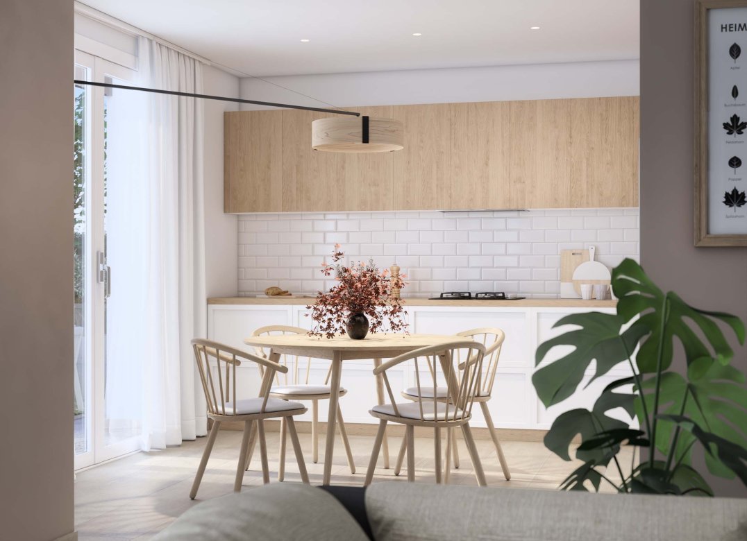Bilocale a Piano Primo con soggiorno con cucina a vista, una camera, un bagno, disimpegno, portico e terrazzo di 10 mq. Classe energetica A3 (valore di progetto).