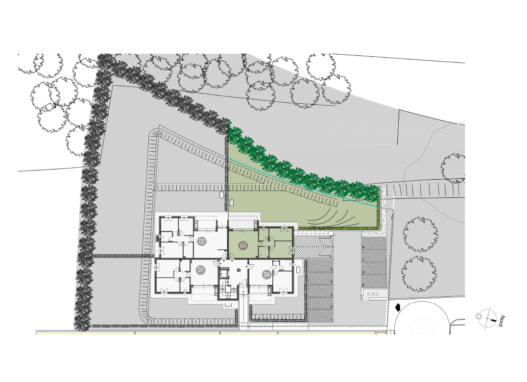 Quadrilocale a Piano Terra con soggiorno con cucina a vista, tre camere, due bagni, portico, giardino di proprietà di 218 mq e prato di 658 mq. Classe energetica A3 (valore di progetto).