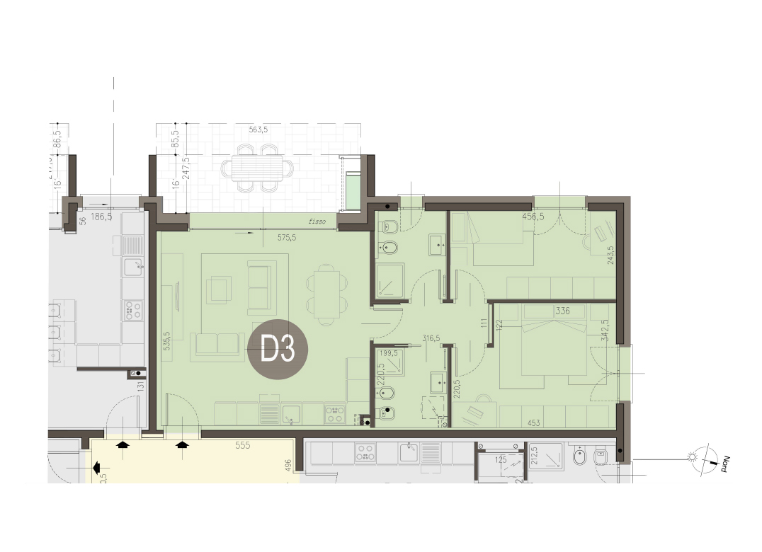 Trilocale a Piano Primo con soggiorno con cucina a vista, due camere, due bagni e terrazzo di 13 mq Classe energetica A3 (valore di progetto).