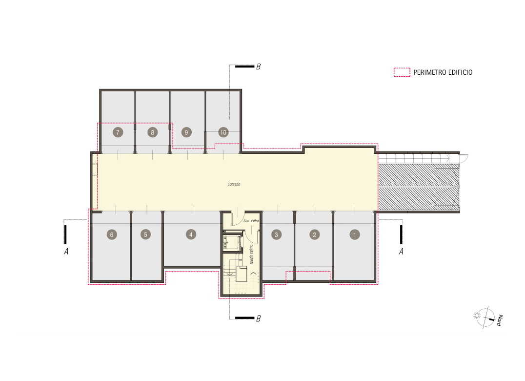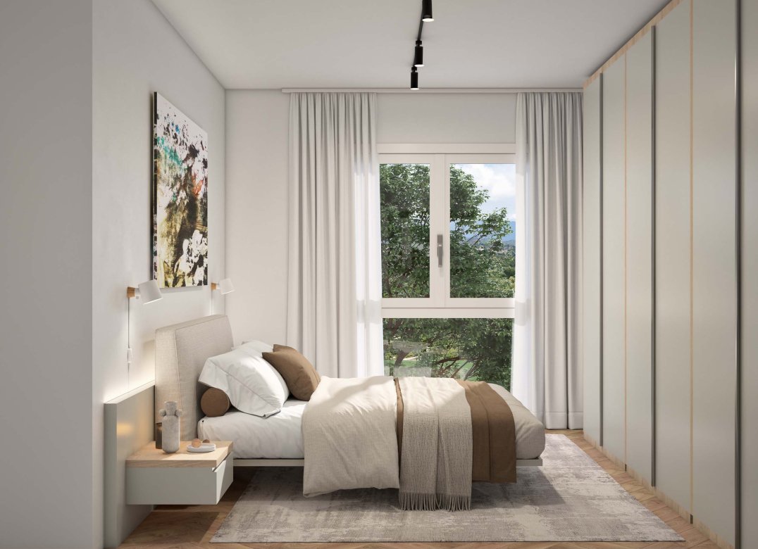 Bilocale a Piano Primo con soggiorno con cucina a vista, una camera, un bagno, disimpegno, portico e terrazzo di 10 mq. Classe energetica A3 (valore di progetto).