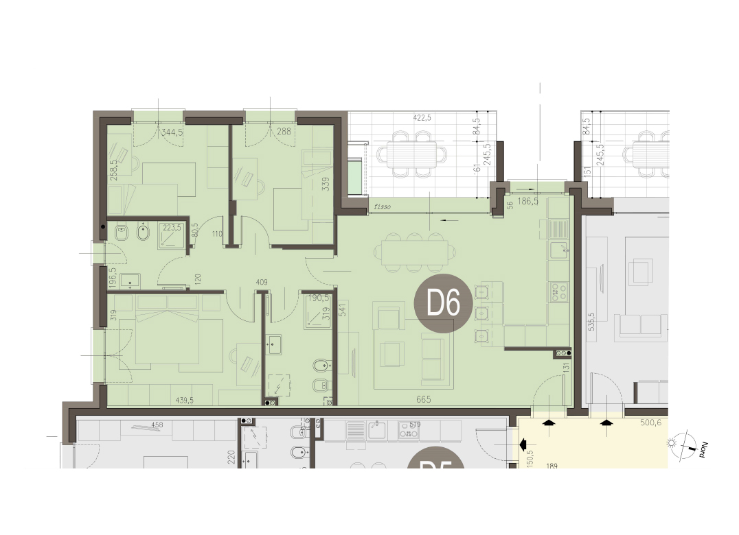 Quadrilocale a Piano Primo con soggiorno con cucina a vista, tre camere, due bagni e terrazzo di 10 mq Classe energetica A3 (valore di progetto). Le immagini e la rappresentazione grafica dei prodotti (immagini, dati tecnici e descrizioni) è realizzata al solo scopo di illustrare il prodotto ed è puramente indicativa. I prodotti possono pertanto differire da quanto rappresentato.