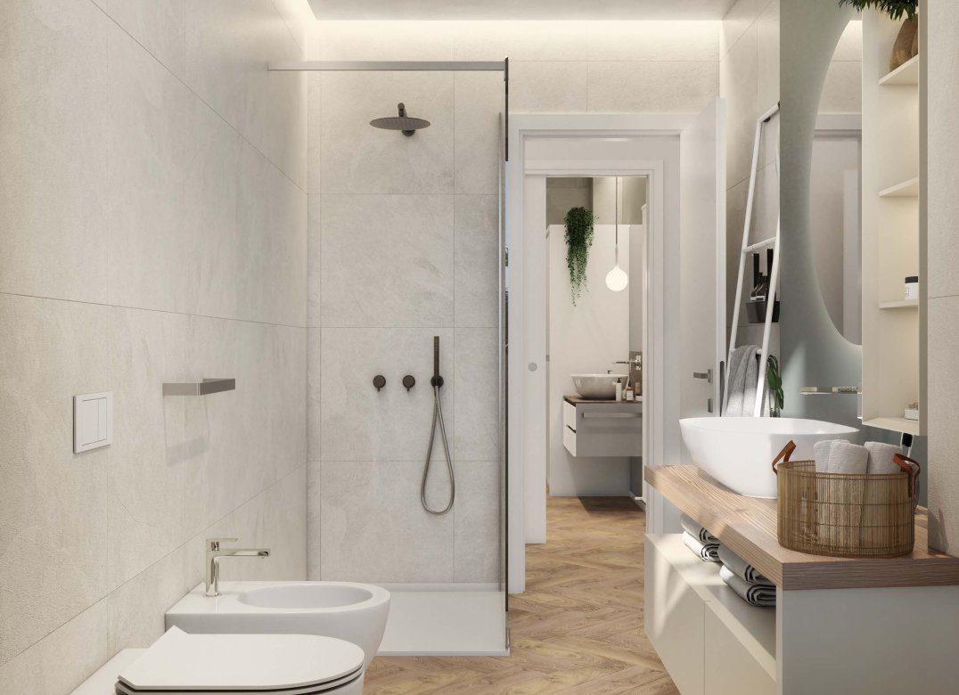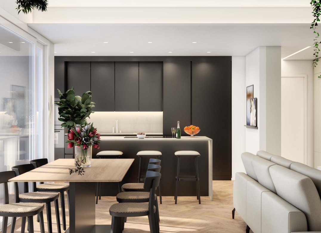 Quadrilocale a Piano Primo con soggiorno con cucina a vista, tre camere, due bagni e terrazzo di 10 mq Classe energetica A3 (valore di progetto).