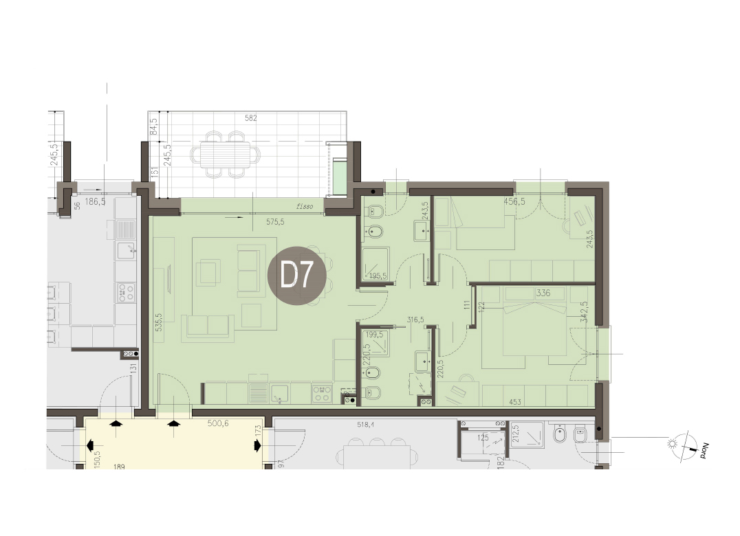 Trilocale a Piano Primo con soggiorno con cucina a vista, due camere, due bagni e terrazzo di 13 mq Classe energetica A3 (valore di progetto). Le immagini e la rappresentazione grafica dei prodotti (immagini, dati tecnici e descrizioni) è realizzata al solo scopo di illustrare il prodotto ed è puramente indicativa. I prodotti possono pertanto differire da quanto rappresentato.