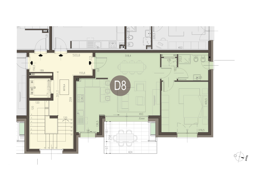 Bilocale a Piano Primo con soggiorno con cucina a vista, una camera, un bagno, disimpegno, portico e terrazzo di 10 mq. Classe energetica A3 (valore di progetto).