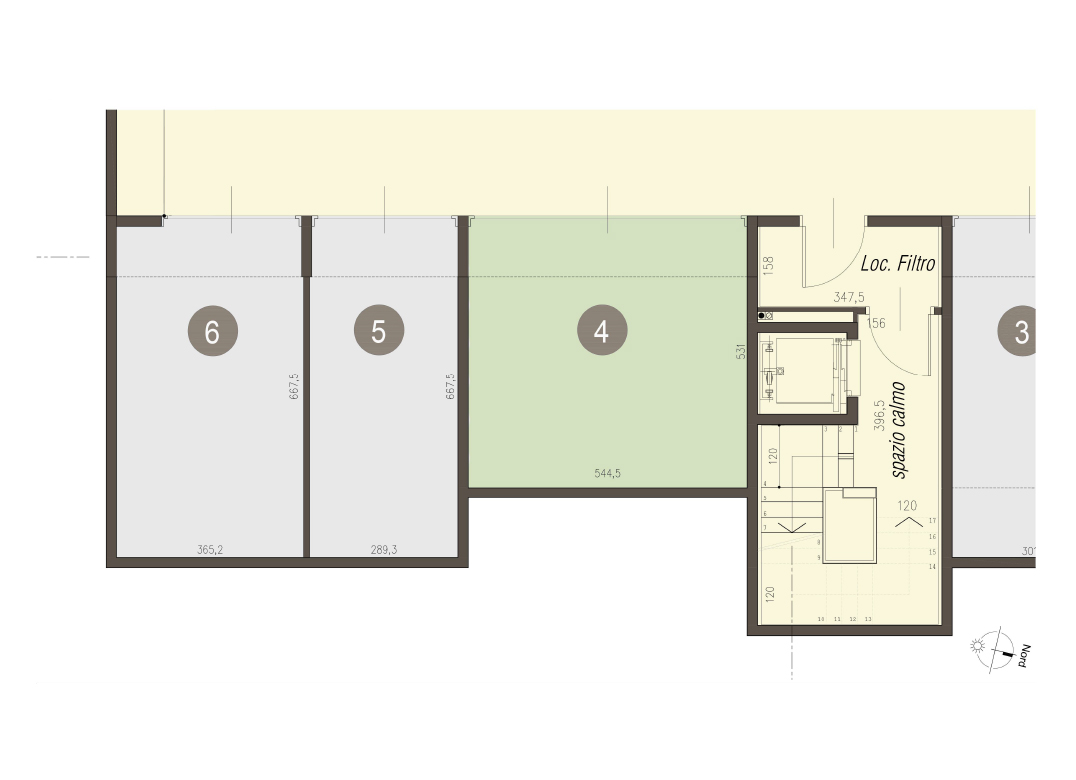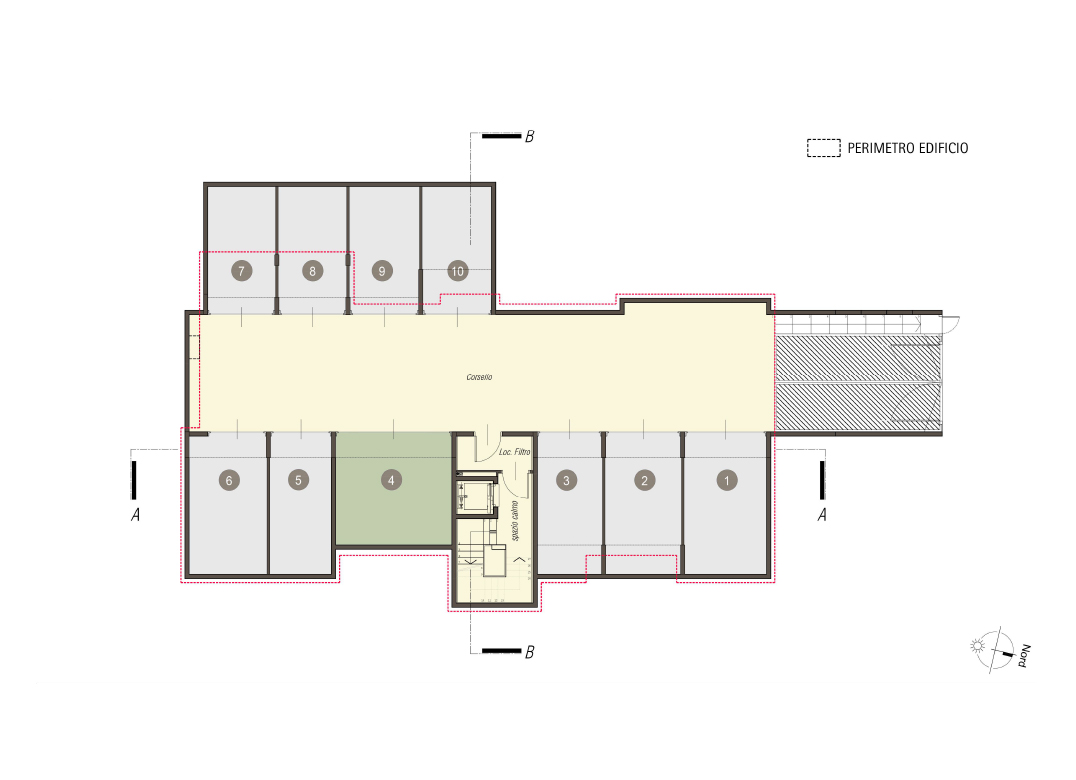 Bilocale a Piano Primo con soggiorno con cucina a vista, una camera, un bagno, disimpegno, portico e terrazzo di 10 mq. Classe energetica A3 (valore di progetto).