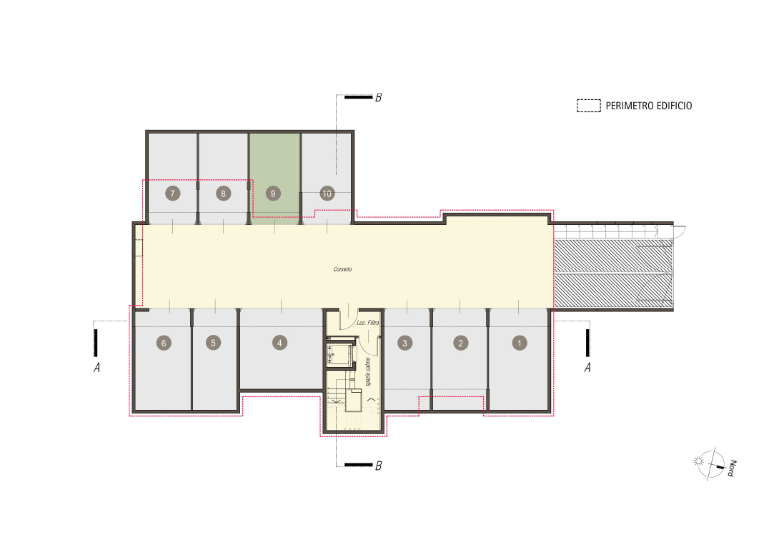 Bilocale a Piano Primo con soggiorno con cucina a vista, una camera, un bagno, disimpegno, portico e terrazzo di 10 mq. Classe energetica A3 (valore di progetto).