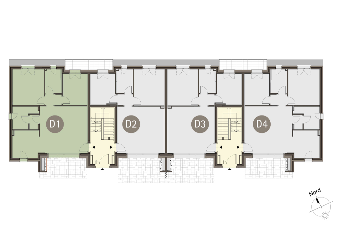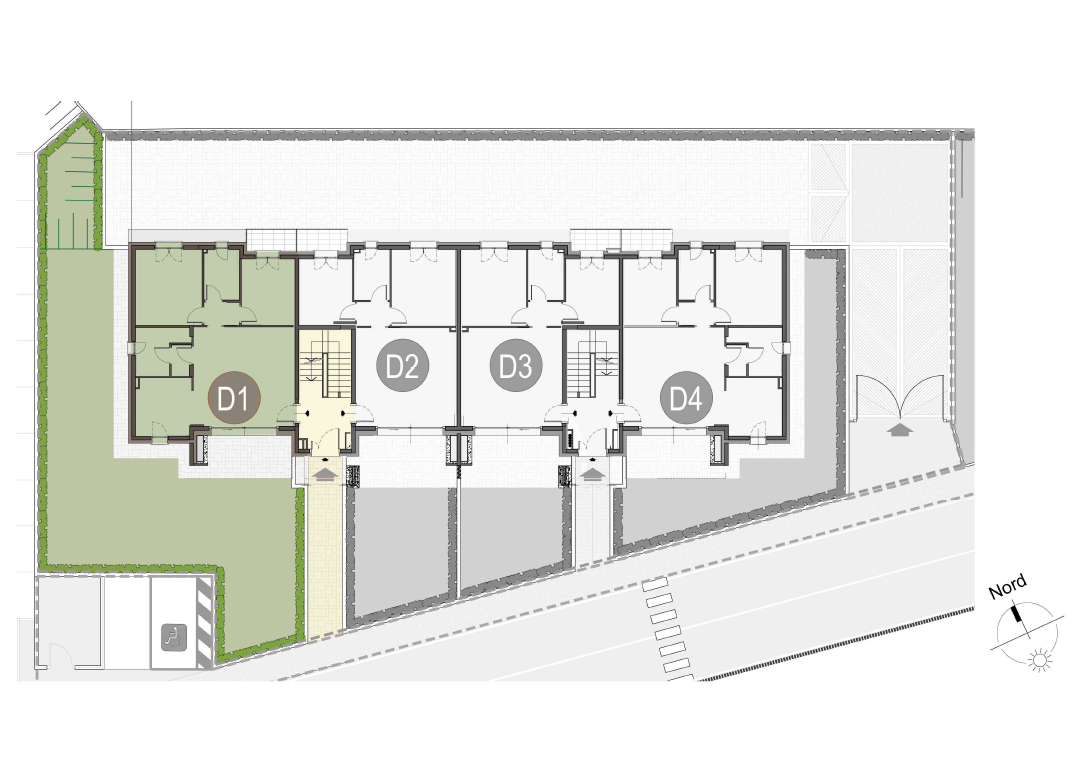 Trilocale a piano terra con soggiorno con cucina a vista, due camere, un bagno, disimpegno, portico e giardino di proprietà di 43 mq. Classe energetica A3 (valore di progetto).
