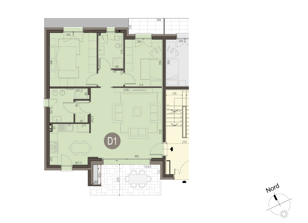 Trilocale a piano terra con soggiorno con cucina angolo cottura, due camere, due bagni, disimpegno, portico e giardino di proprietà di 76 mq. Classe energetica A3 (valore di progetto).