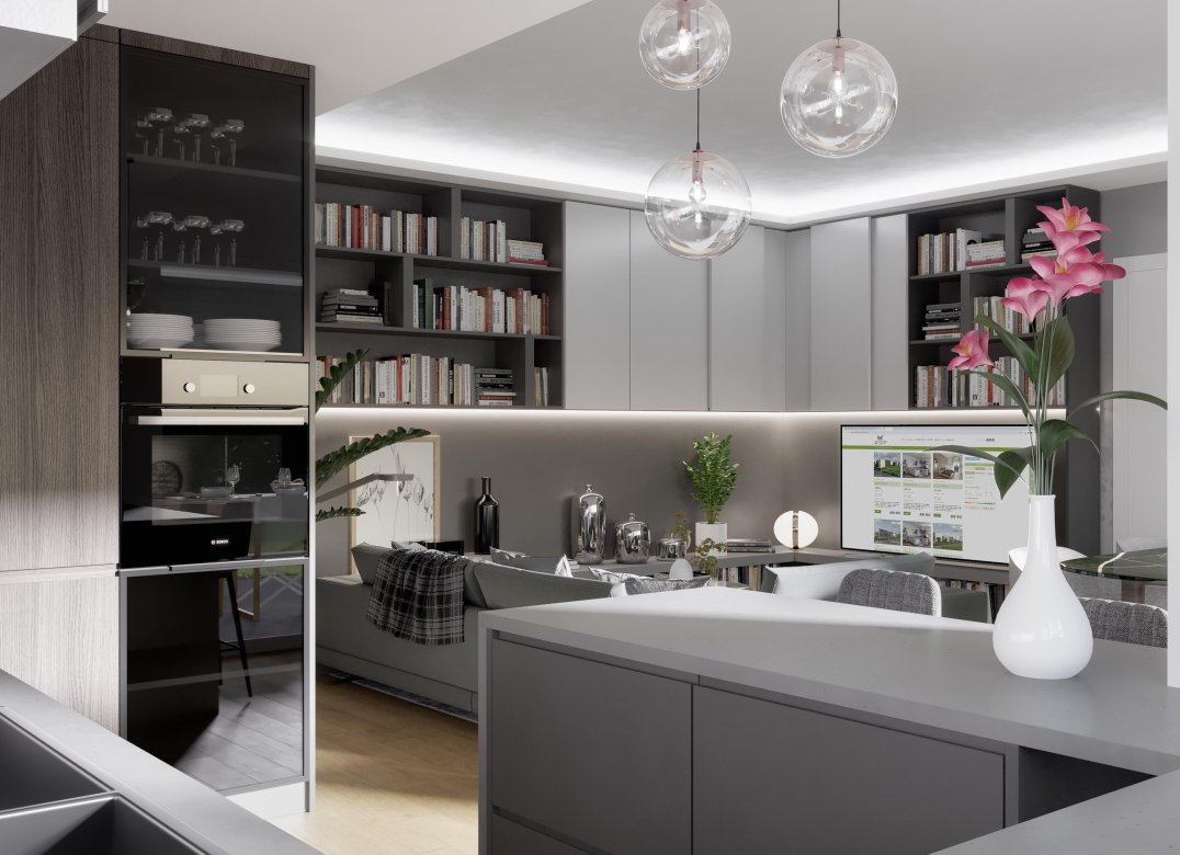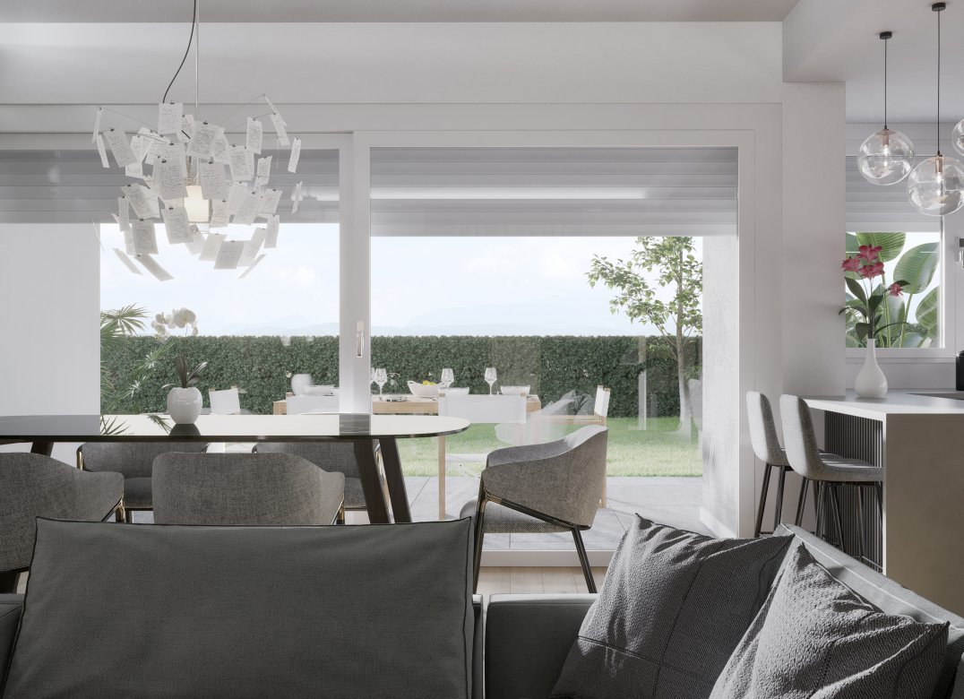 Trilocale a piano terra con soggiorno con cucina a vista, due camere, un bagno, disimpegno, portico e giardino di proprietà di 34 mq. Classe energetica A3 (valore di progetto).
