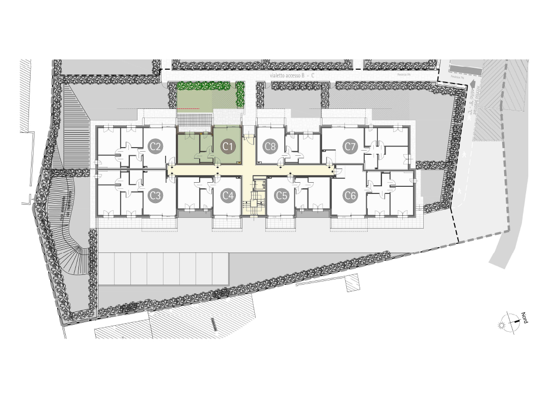 Bilocale a Piano Terra con soggiorno con cucina a vista, una camera, un bagno, disimpegno, portico e giardino di proprietà di 45 mq. Classe energetica A3 valore di progetto.