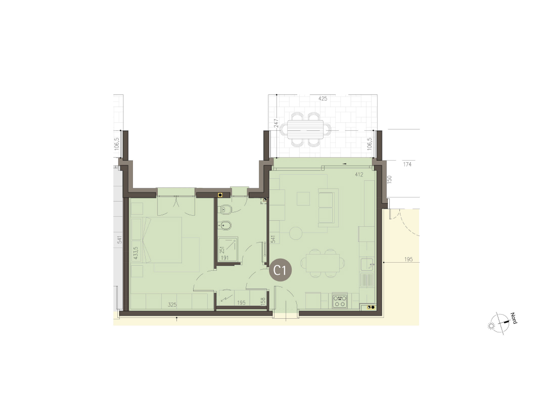 Bilocale a Piano Terra con soggiorno con cucina a vista, una camera, un bagno, disimpegno, portico e giardino di proprietà di 45 mq. Classe energetica A3 valore di progetto. Le immagini e la rappresentazione grafica dei prodotti (immagini, dati tecnici e descrizioni) è realizzata al solo scopo di illustrare il prodotto ed è puramente indicativa. I prodotti possono pertanto differire da quanto rappresentato.