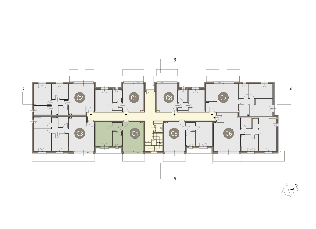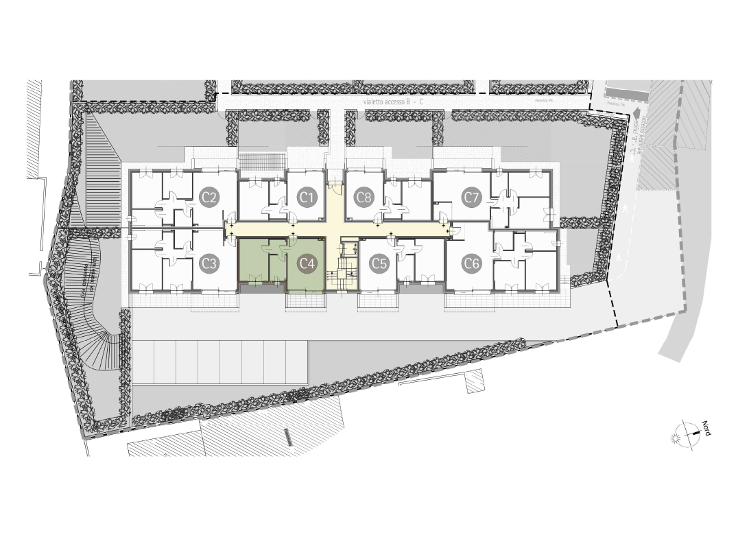 Trilocale a Piano Primo con soggiorno con cucina a vista, due camere, un bagno, disimpegno e terrazzo di 11 mq. Impianto fotovoltaico privato da 3 kw. Classe energetica A3 valore di progetto.