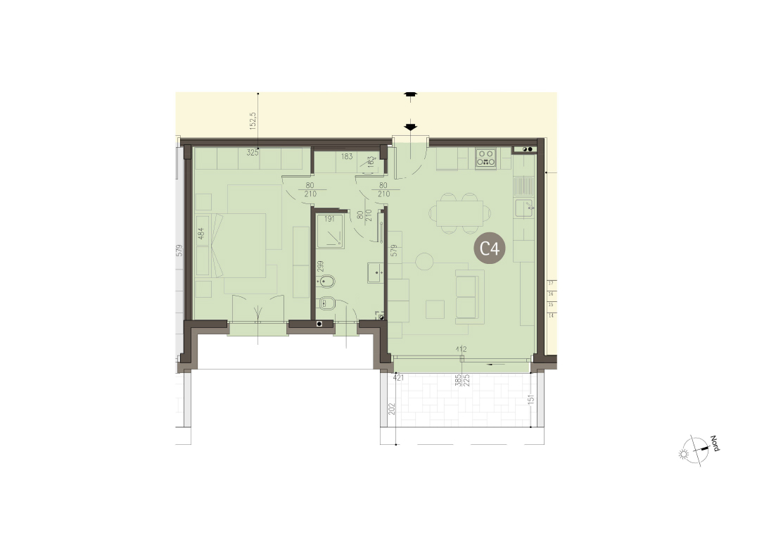 Bilocale a Piano Terra con soggiorno con cucina a vista, una camera, un bagno, disimpegno e portico di 7 mq. Classe energetica A3 valore di progetto. Le immagini e la rappresentazione grafica dei prodotti (immagini, dati tecnici e descrizioni) è realizzata al solo scopo di illustrare il prodotto ed è puramente indicativa. I prodotti possono pertanto differire da quanto rappresentato.