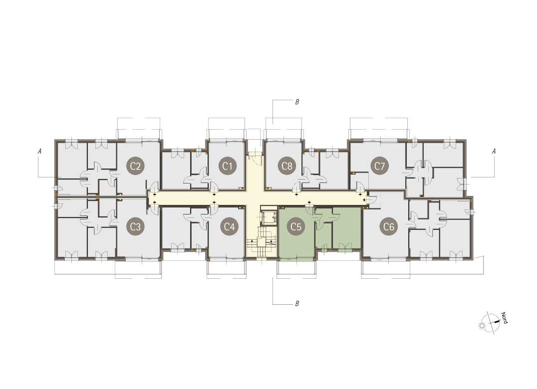 Bilocale a Piano Primo con soggiorno con cucina a vista, una camere, un bagno, disimpegno e terrazzo di 9 mq. Classe energetica A3 valore di progetto.