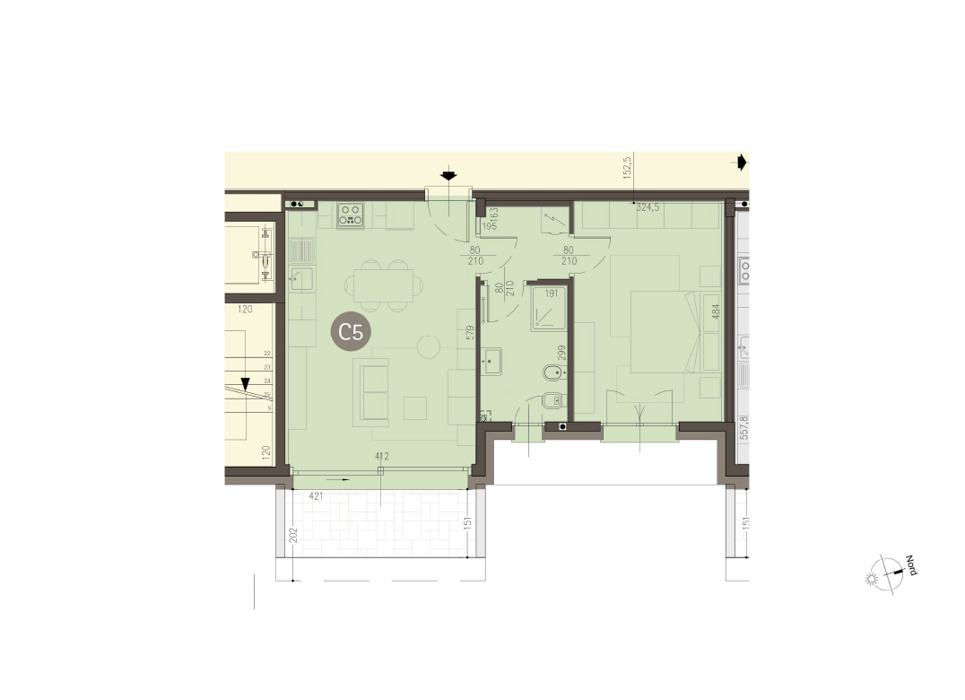 Bilocale a Piano Terra con soggiorno con cucina a vista, una camera, un bagno, disimpegno e portico di 7 mq. Classe energetica A3 valore di progetto. le immagini e la rappresentazione grafica dei prodotti (immagini, dati tecnici e descrizioni) è realizzata al solo scopo di illustrare il prodotto ed è puramente indicativa. I prodotti possono pertanto differire da quanto rappresentato.
