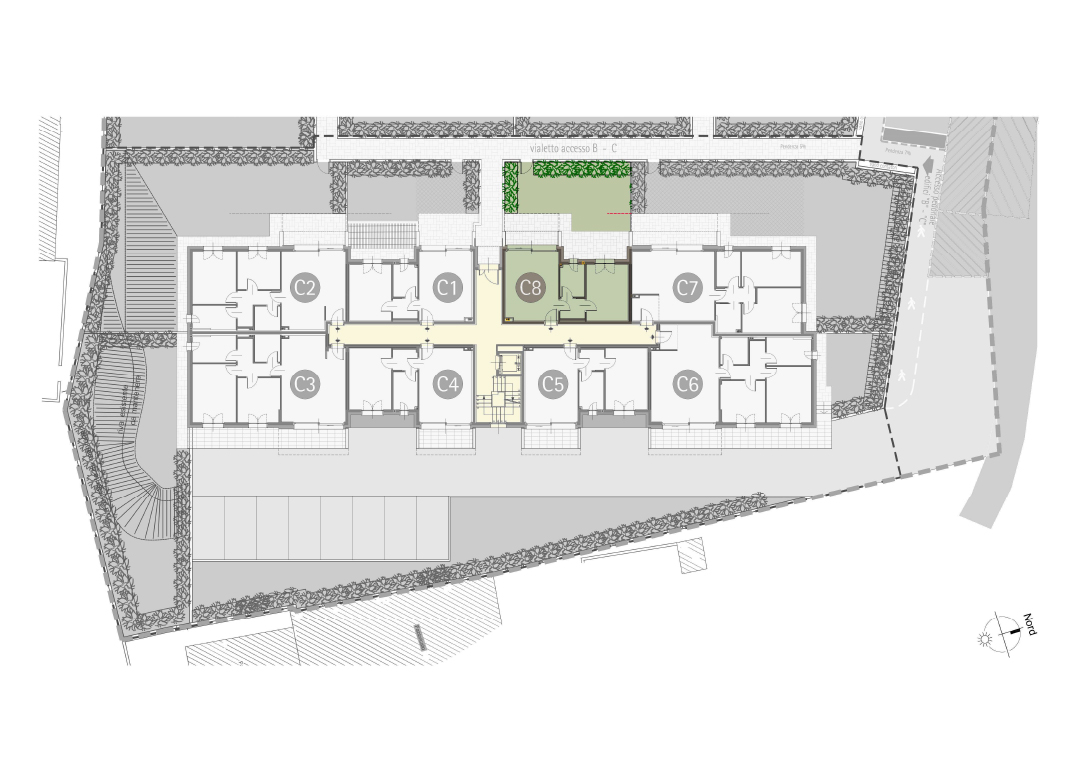 Trilocale a Piano Primo con soggiorno con cucina a vista, due camere, un bagno, disimpegno e terrazzo di 11 mq. Impianto fotovoltaico privato da 3 kw. Classe energetica A3 valore di progetto.