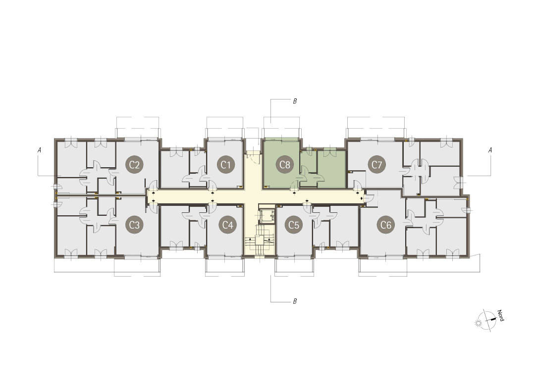 Bilocale a Piano Primo con soggiorno con cucina a vista, una camere, un bagno, disimpegno e terrazzo di 9 mq. Classe energetica A3 valore di progetto.