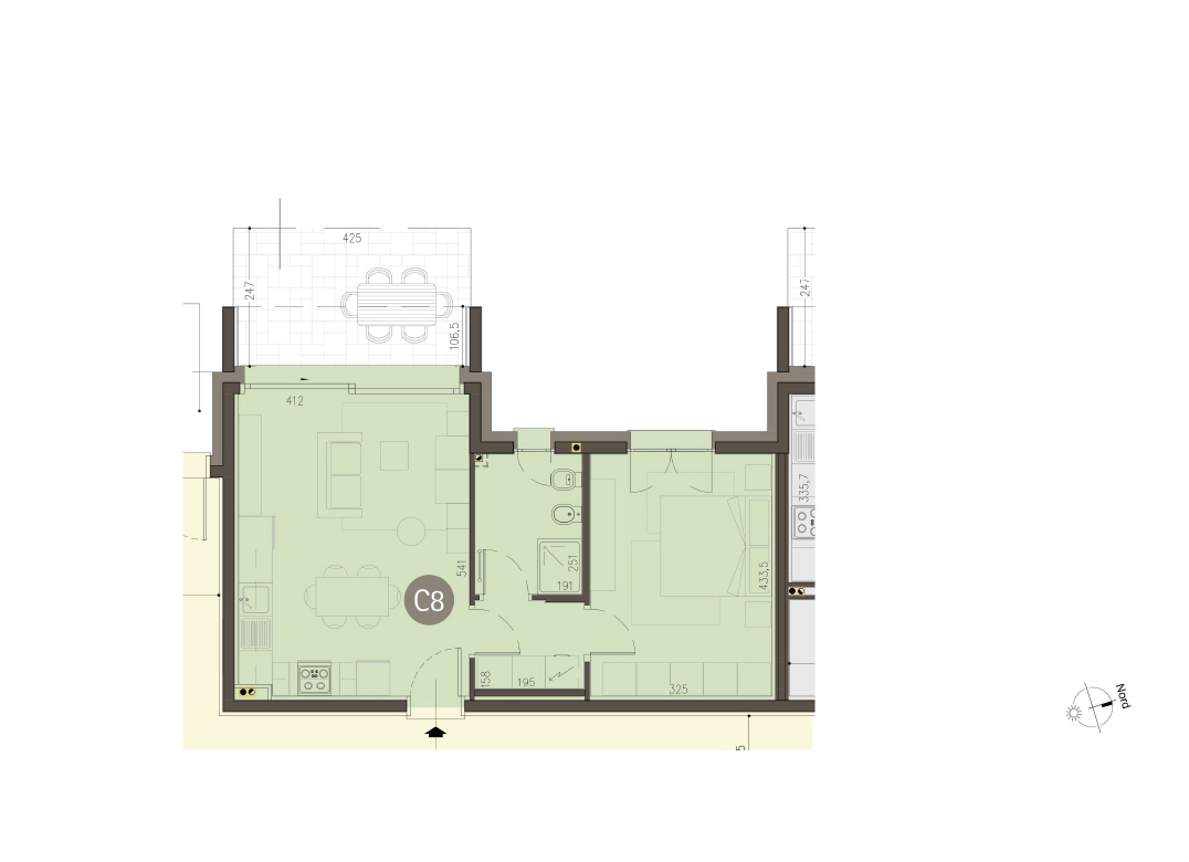 Bilocale a Piano Terra con soggiorno con cucina a vista, una camera, un bagno, disimpegno, portico e giardino di proprietà di 47 mq. Classe energetica A3 valore di progetto. Le immagini e la rappresentazione grafica dei prodotti (immagini, dati tecnici e descrizioni) è realizzata al solo scopo di illustrare il prodotto ed è puramente indicativa. I prodotti possono pertanto differire da quanto rappresentato.