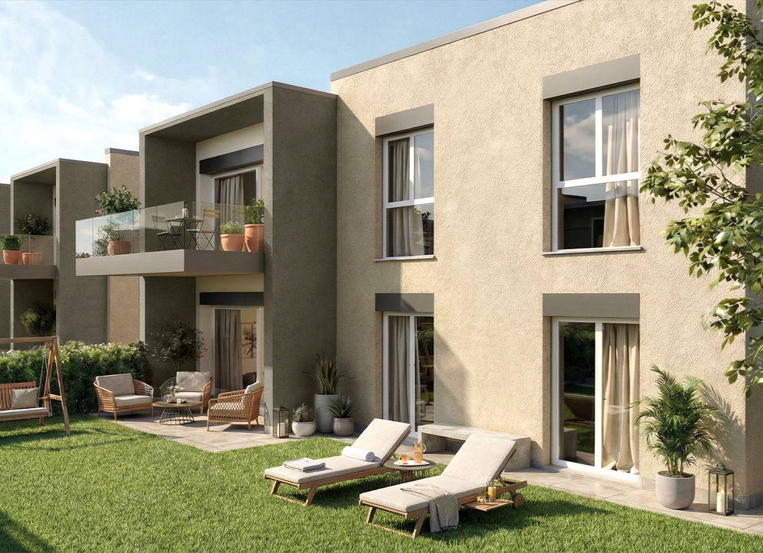 Bilocale a Piano Terra con soggiorno con cucina a vista, una camera, un bagno, disimpegno, portico e giardino di proprietà di 45 mq. Classe energetica A3 valore di progetto.