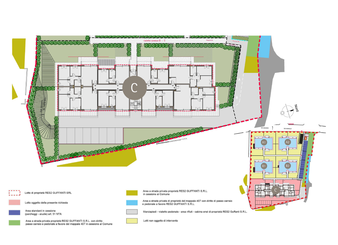 Trilocale a Piano Terra con soggiorno con angolo cottura, due camere, due bagni, disimpegno, portico e giardino di proprietà di 33 mq. Impianto fotovoltaico privato da 3 kw. Classe energetica A3 valore di progetto.