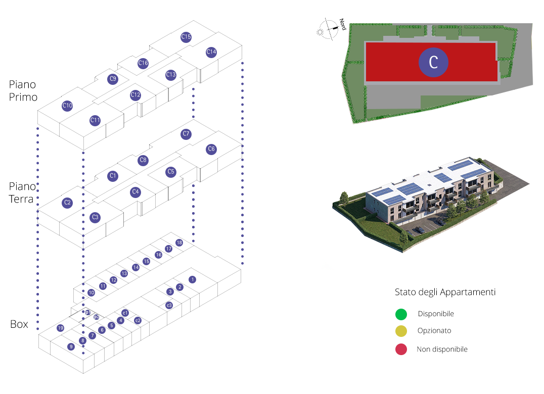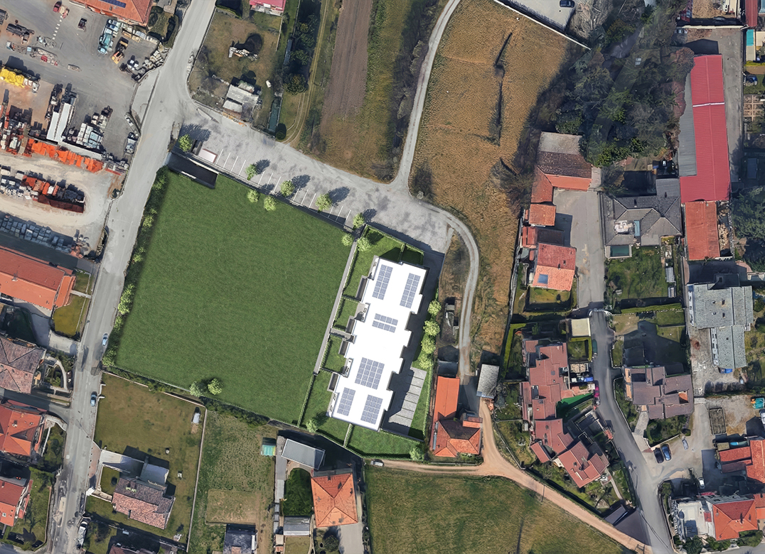 Bilocale a Piano Primo con soggiorno con cucina a vista, una camere, un bagno, disimpegno e terrazzo di 10 mq. Impianto fotovoltaico privato da 3 kw. Classe energetica A3 valore di progetto.