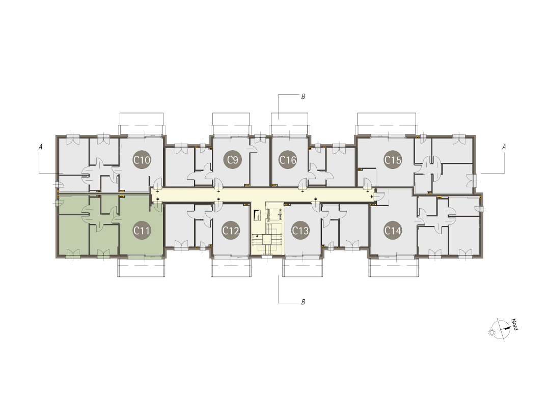 Trilocale a Piano Primo con soggiorno con cucina a vista, due camere, un bagno, disimpegno e terrazzo di 11 mq. Impianto fotovoltaico privato da 3 kw. Classe energetica A3 valore di progetto.