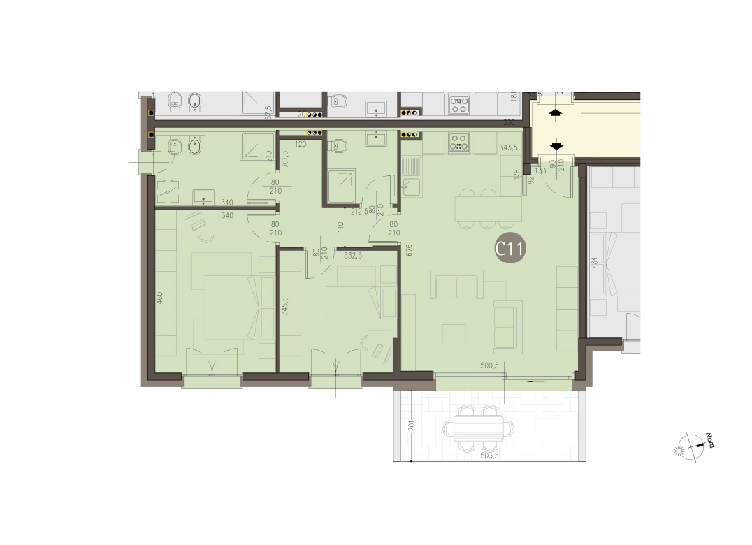 Trilocale a Piano Primo con soggiorno con angolo cottura, due camere, due bagni e terrazzo di 16 mq. Impianto fotovoltaico privato da 3 kw. Classe energetica A3 valore di progetto.