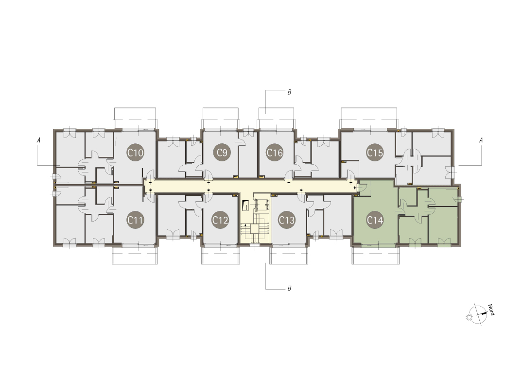 Bilocale a Piano Primo con soggiorno con cucina a vista, una camere, un bagno, disimpegno e terrazzo di 9 mq. Classe energetica A3 valore di progetto.