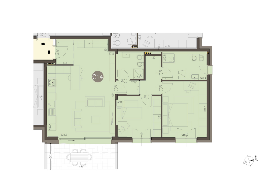 Trilocale a Piano Primo con soggiorno con angolo cottura, due camere, due bagni, disimpegno e terrazzo di 13 mq. Impianto fotovoltaico privato da 3 kw. Classe energetica A3 valore di progetto.