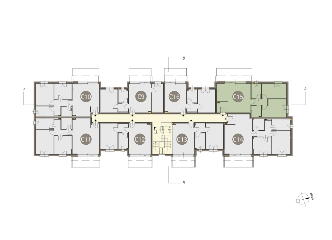 Bilocale a Piano Primo con soggiorno con cucina a vista, una camere, un bagno, disimpegno e terrazzo di 9 mq. Classe energetica A3 valore di progetto.