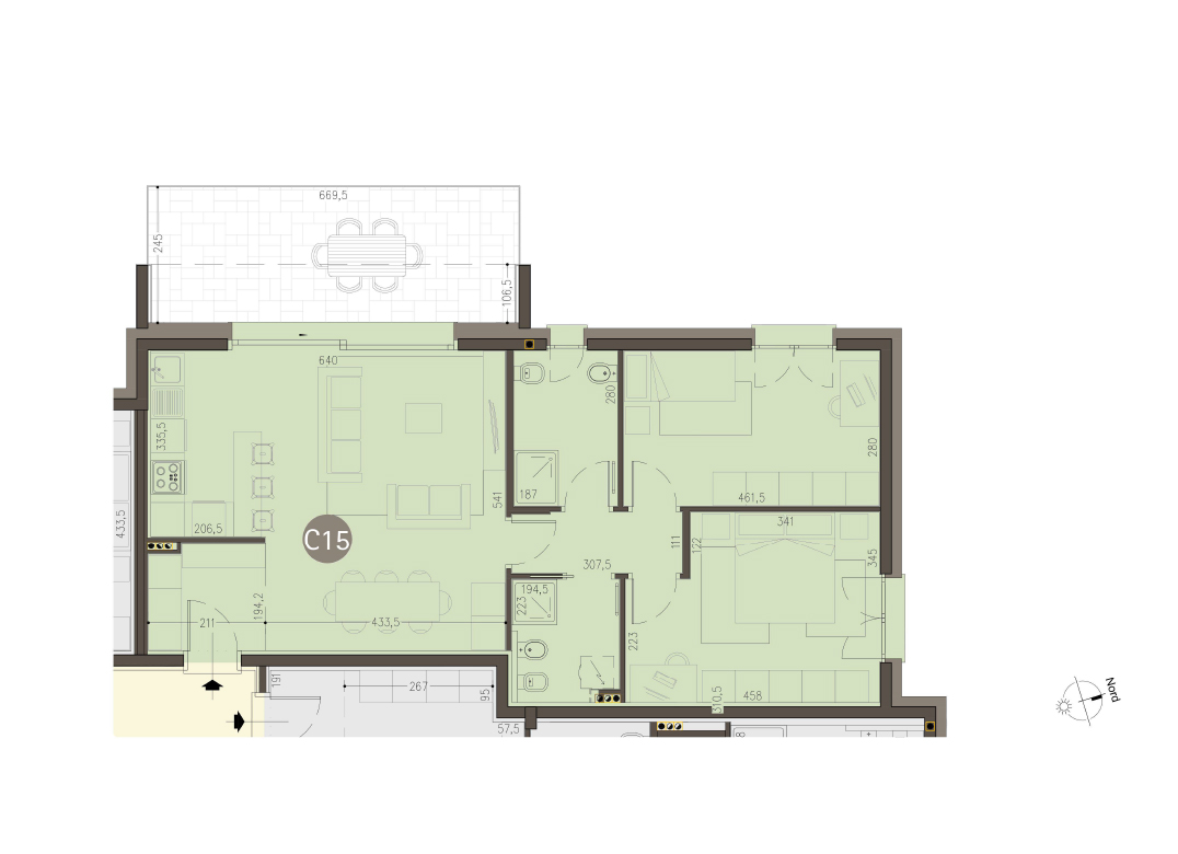 Trilocale a Piano Primo con soggiorno con angolo cottura, due camere, due bagni e terrazzo di 16 mq. Impianto fotovoltaico privato da 3 kw. Classe energetica A3 valore di progetto. Le immagini e la rappresentazione grafica dei prodotti (immagini, dati tecnici e descrizioni) è realizzata al solo scopo di illustrare il prodotto ed è puramente indicativa. I prodotti possono pertanto differire da quanto rappresentato.