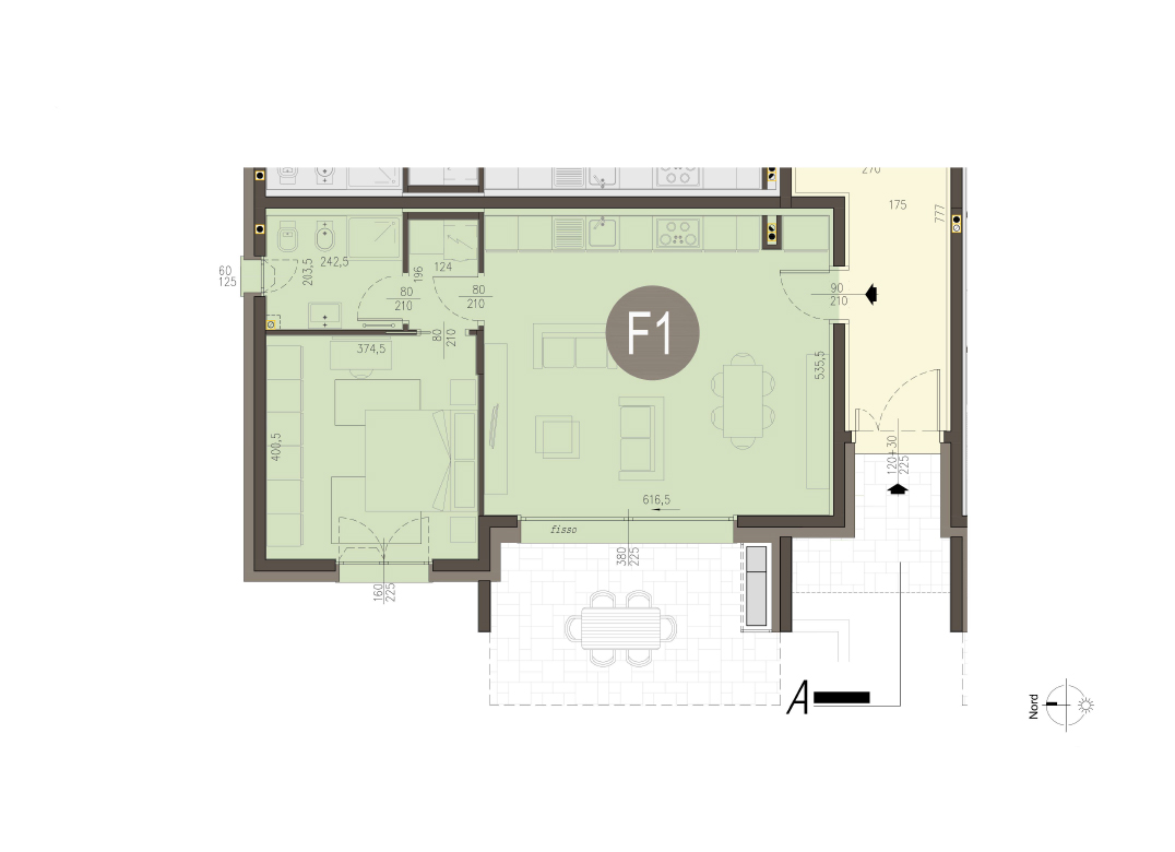 Bilocale a piano terra con soggiorno,cucina, una camera, un bagno, disimpegno, portico e giardino di proprietà di 135 mq. Classe energetica A3 (valore di progetto). Le immagini e la rappresentazione grafica dei prodotti (immagini, dati tecnici e descrizioni) è realizzata al solo scopo di illustrare il prodotto ed è puramente indicativa. I prodotti possono pertanto differire da quanto rappresentato.