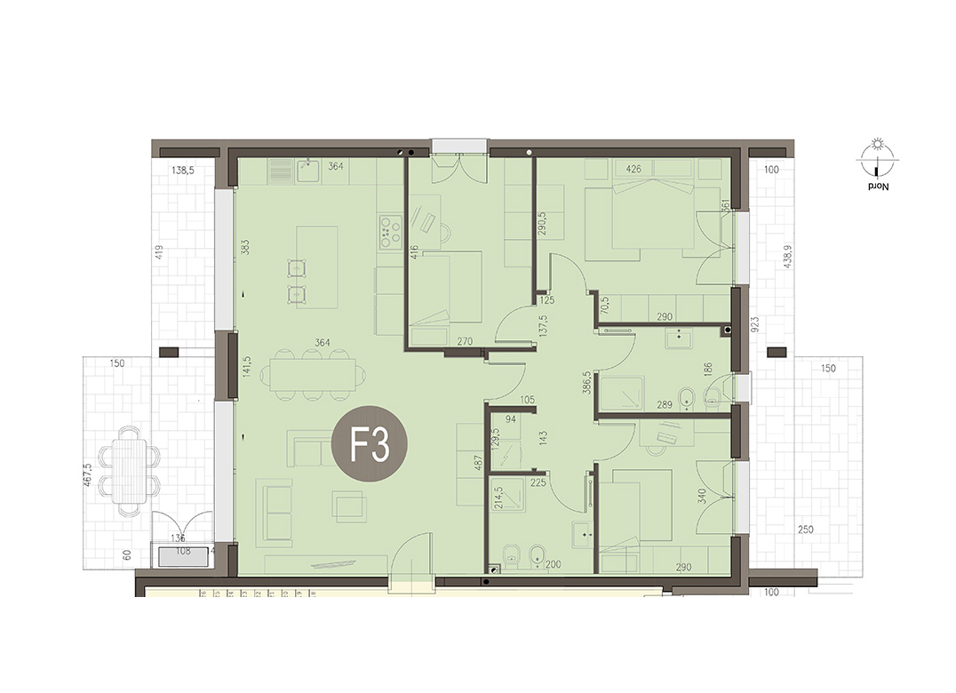 Quadrilocale a piano terra con soggiorno,cucina, tre camere, due bagni, disimpegno, portico e giardino di proprietà di 422 mq. Classe energetica A3 (valore di progetto).