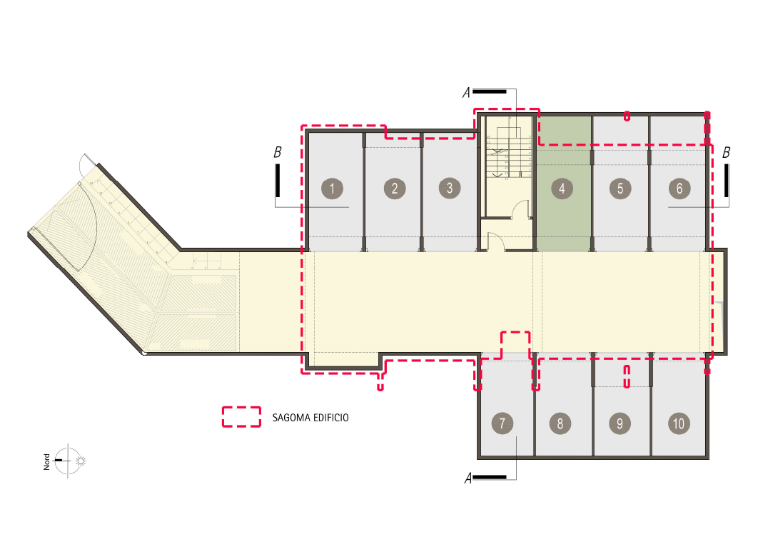Trilocale a piano primo con soggiorno con cucina a vista, una camera, un bagno, disimpegno e terrazzo di 10 mq. Classe energetica A3 (valore di progetto).
