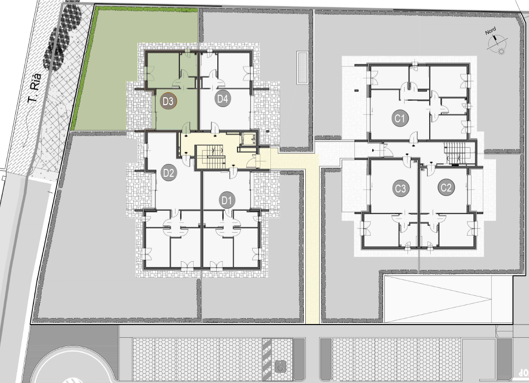 Trilocale a Piano Terra con soggiorno con angolo cottura, due camere, due bagni, disimpegno, portico e giardino di proprietà di 275 mq. Classe energetica A3 (valore di progetto).