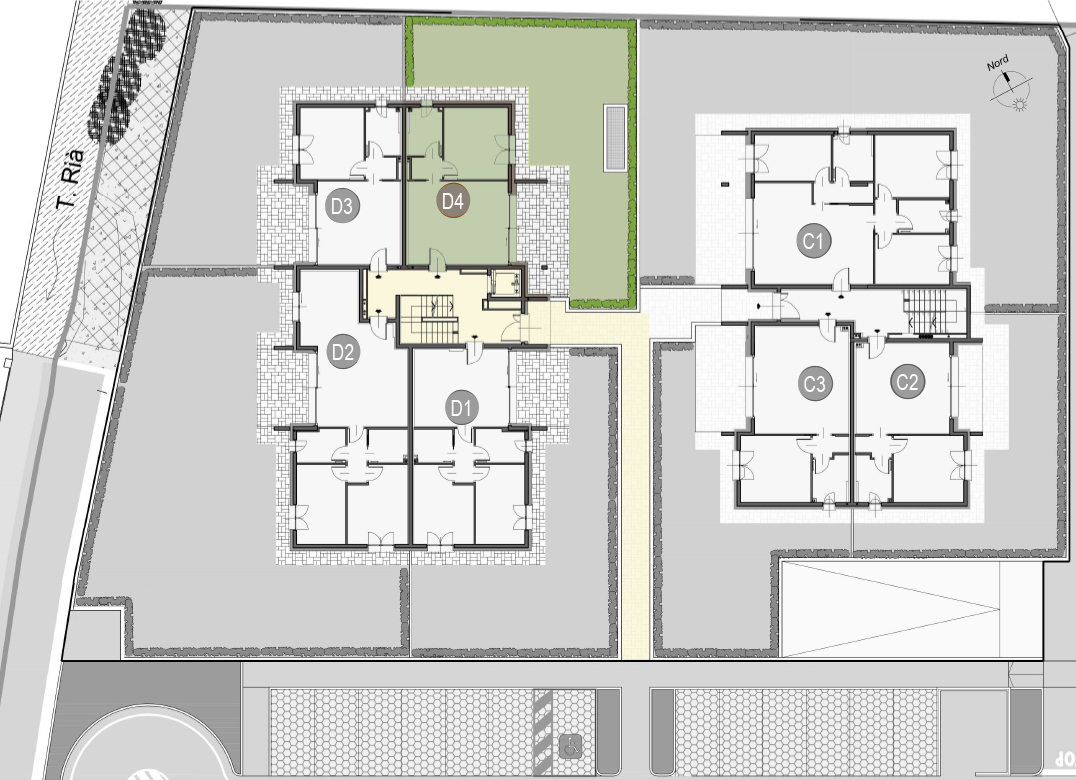 Trilocale a Piano Terra con soggiorno con angolo cottura, due camere, due bagni, disimpegno, portico e giardino di proprietà di 275 mq. Classe energetica A3 (valore di progetto).