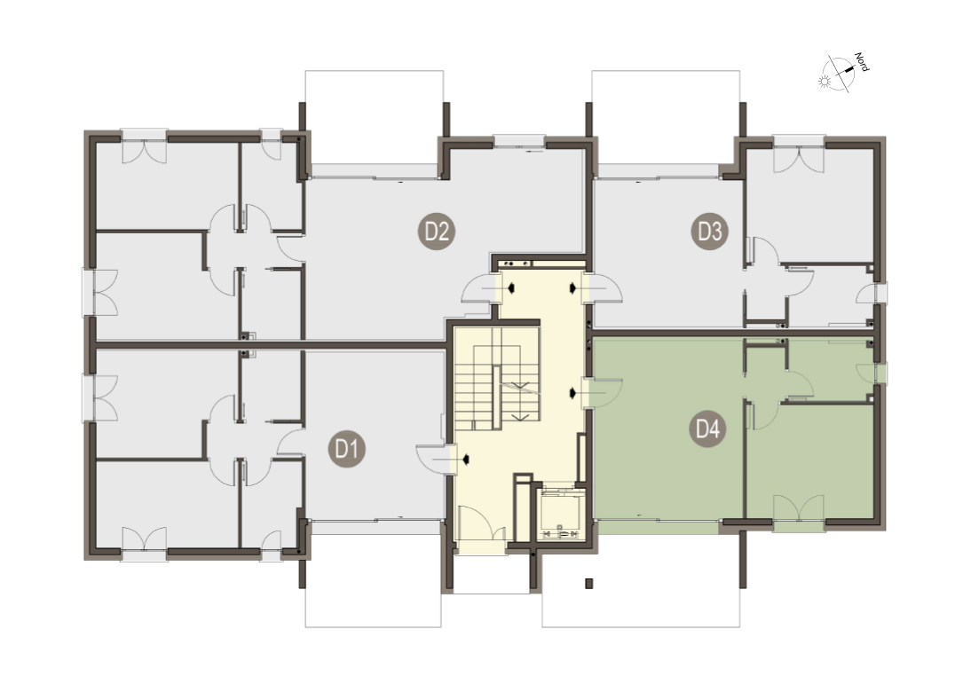 Quadrilocale a Piano Primo con soggiorno cucina a vista, due bagni, disimpegno, due camere e uno studio e terrazzo di 24 mq. Classe energetica A3 (valore di progetto).