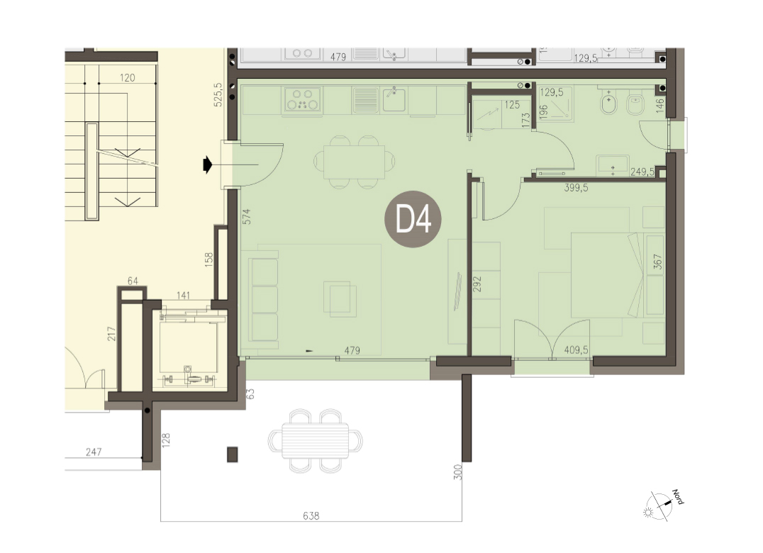 Bilocale a Piano Terra con soggiorno con cucina a vista, una camera, un bagno, disimpegno, portico e giardino di proprietà di 125 mq. Classe energetica A3 (valore di progetto). Le immagini e la rappresentazione grafica dei prodotti (immagini, dati tecnici e descrizioni) è realizzata al solo scopo di illustrare il prodotto ed è puramente indicativa. I prodotti possono pertanto differire da quanto rappresentato.