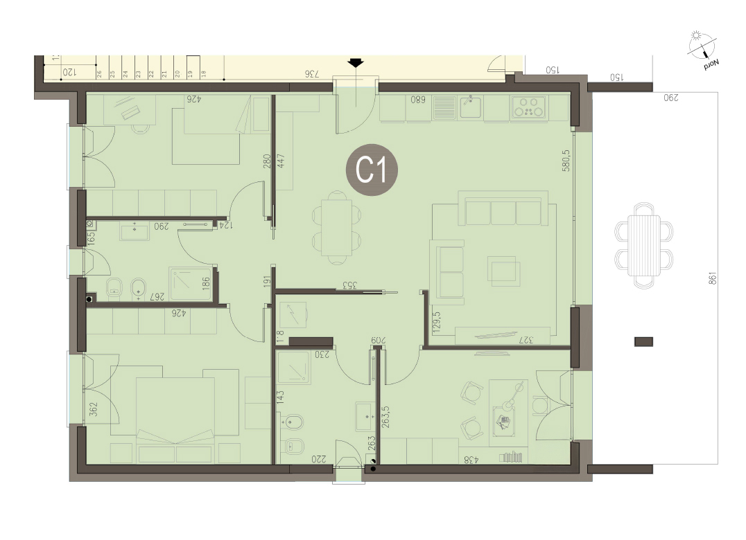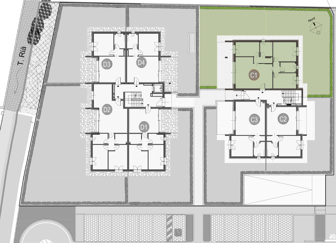 Trilocale a Piano Terra con soggiorno con angolo cottura, due camere, due bagni, disimpegno, portico e giardino di proprietà di 275 mq. Classe energetica A3 valore di progetto.