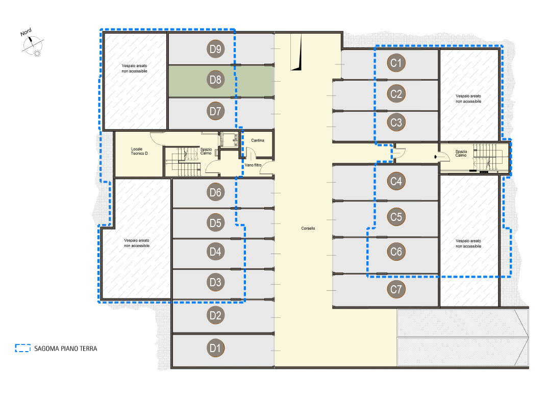 Trilocale a Piano Terra con soggiorno con angolo cottura, due camere, due bagni, disimpegno, portico e giardino di proprietà di 275 mq. Classe energetica A3 (valore di progetto).