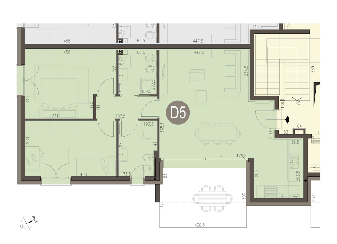 Trilocale Piano Primo con soggiorno con angolo cottura, due camere e due bagni, terrazzo di 12 mq. Classe energetica A3 (valore di progetto).