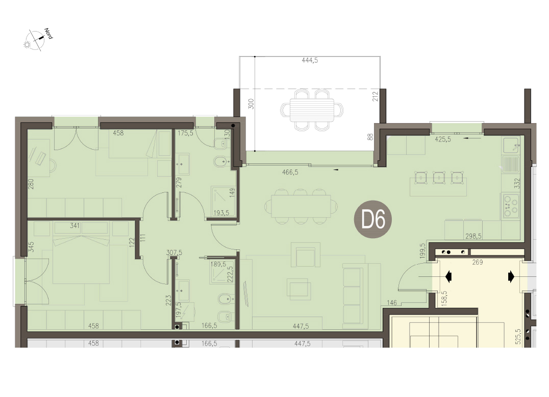 Trilocale Piano Primo con soggiorno con angolo cottura, due camere e due bagni, terrazzo di 12 mq. Classe energetica A3 (valore di progetto). Le immagini e la rappresentazione grafica dei prodotti (immagini, dati tecnici e descrizioni) è realizzata al solo scopo di illustrare il prodotto ed è puramente indicativa. I prodotti possono pertanto differire da quanto rappresentato.
