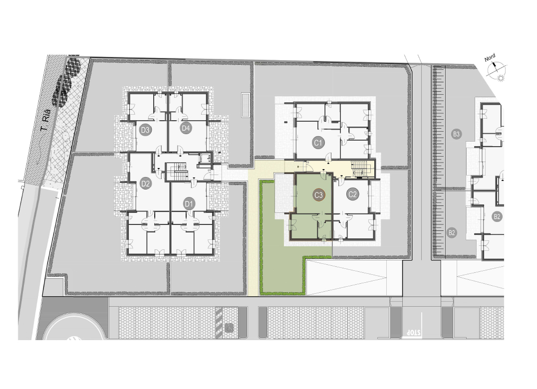 Trilocale a Piano Terra con soggiorno con angolo cottura, due camere, due bagni, disimpegno, portico e giardino di proprietà di 275 mq. Classe energetica A3 (valore di progetto).